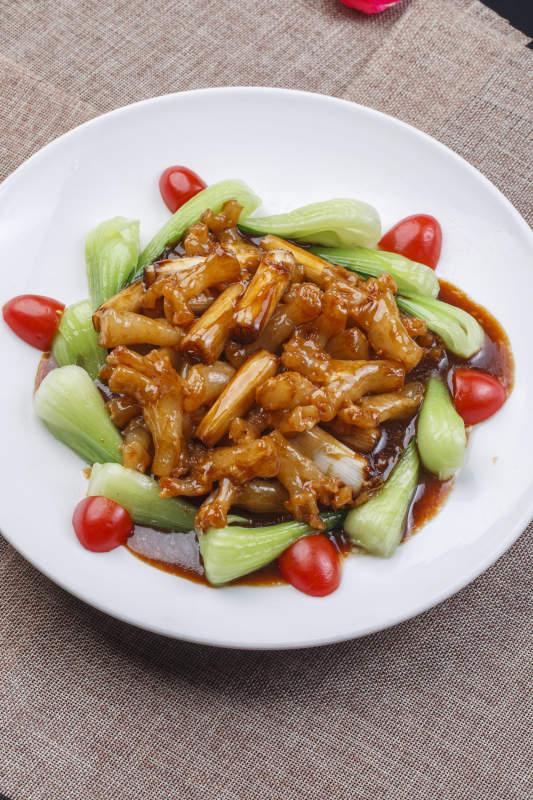 白色长瓷盘装的杏鲍菇牛仔粒
