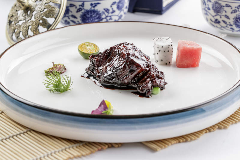 白色瓷盘装的酱烧慢火雪花牛肉
