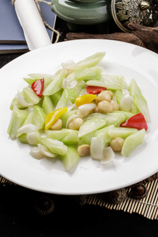 莲子百合炒乳瓜摆放在寿司帘上