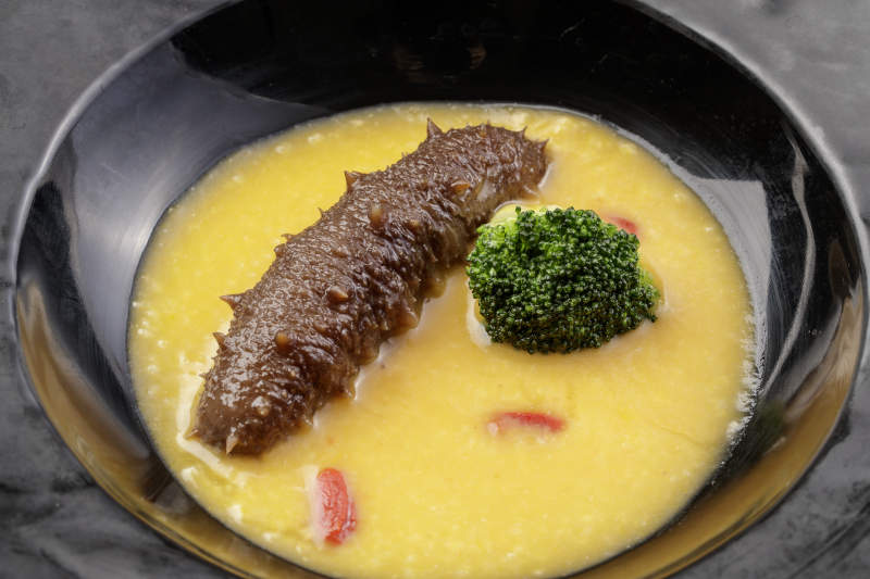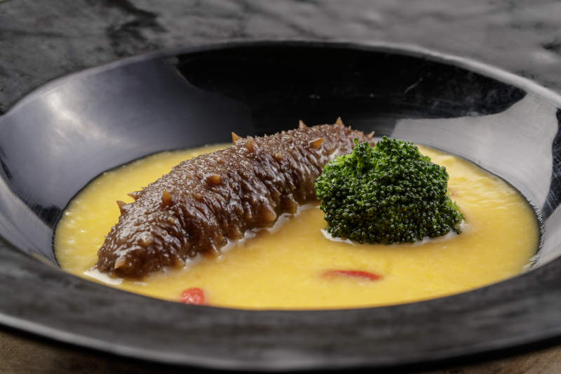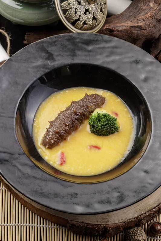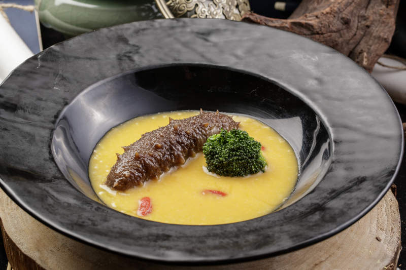 小米扣辽参摆放在樟木砧板上