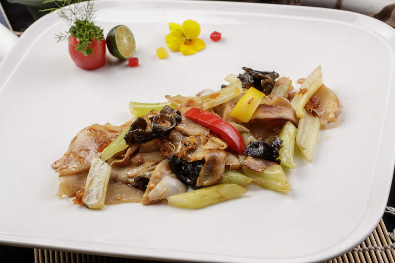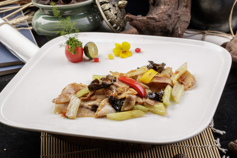 白色瓷盘装的木耳西芹小炒山猪肉