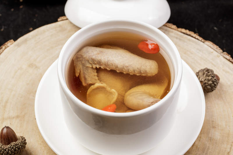 白色瓷汤盅装的西洋参枸杞凤翅汤