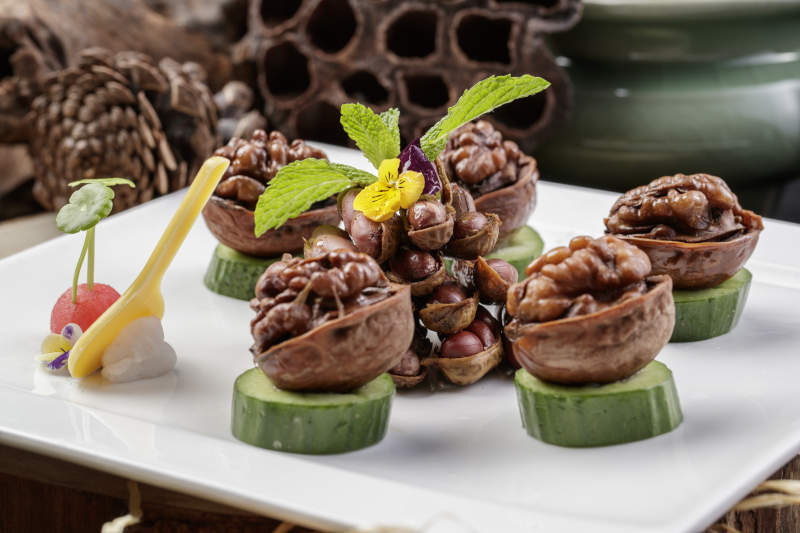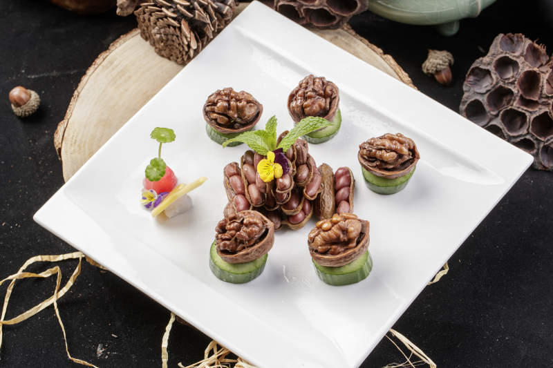 方形瓷盘装的卤味核桃摆放在樟木砧板上
