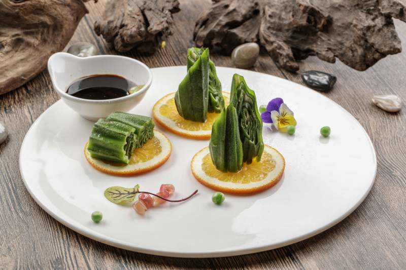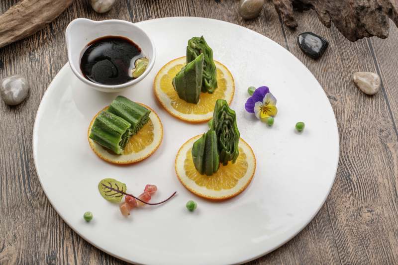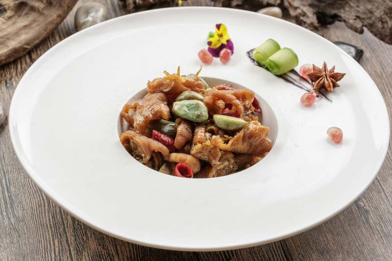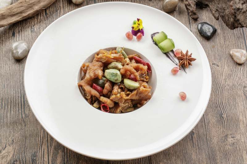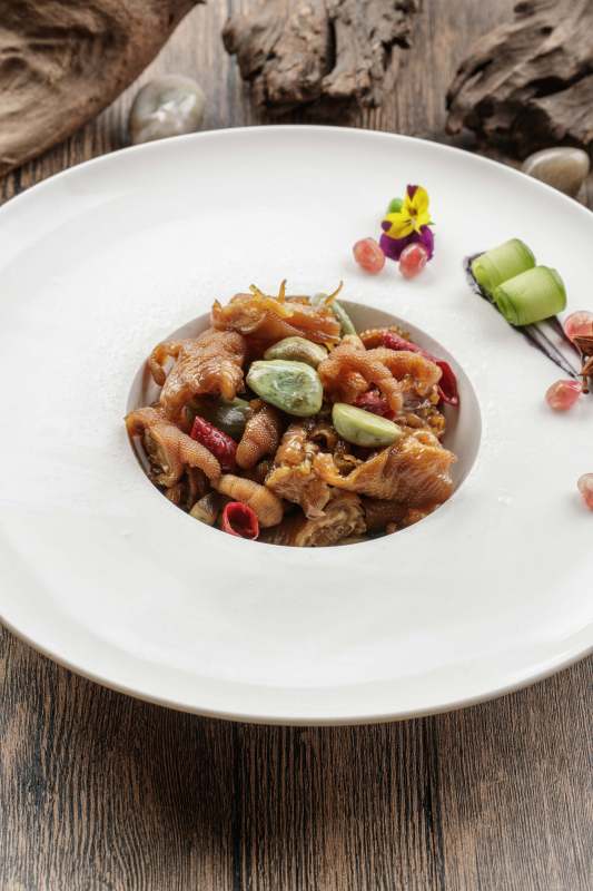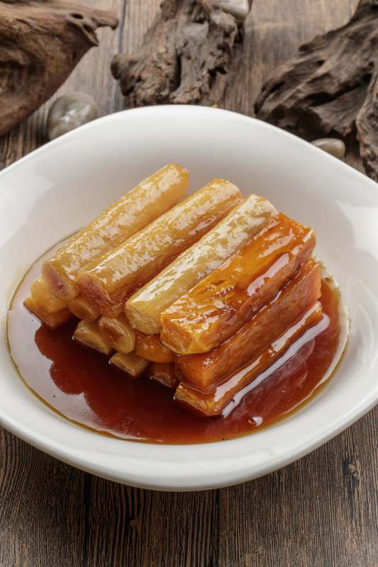 白色圆盘装的土豆焖鲍鱼摆放在樟木砧板上