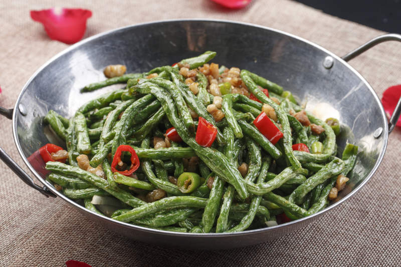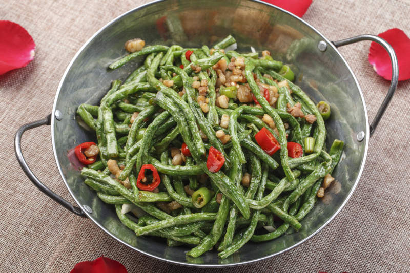 不锈钢铁锅装的香辣锅仔豇豆