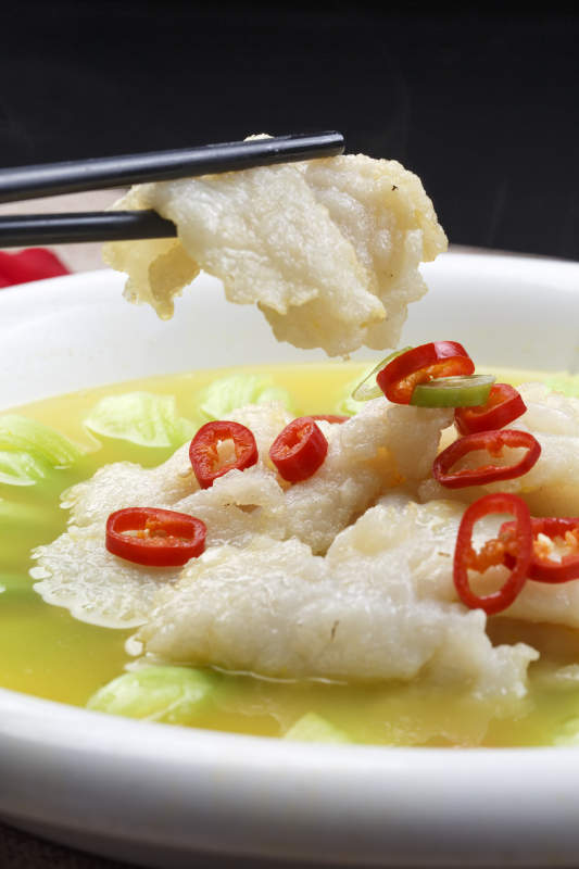 白色圆瓷盘装的酸汤龙利鱼