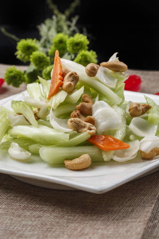 白色方瓷盘装的腰果西芹炒百合