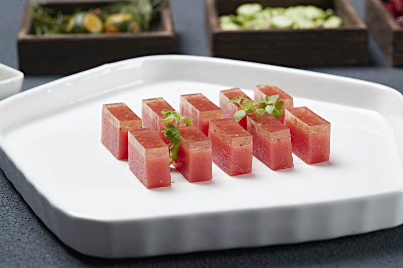 搭配柠檬洋葱生菜的牛肋排摆放在木质砧板上