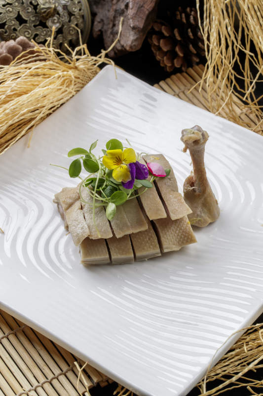 寿司帘上的圆瓷盘装的凉拌穿心莲