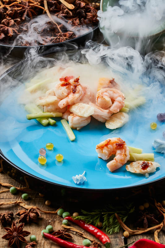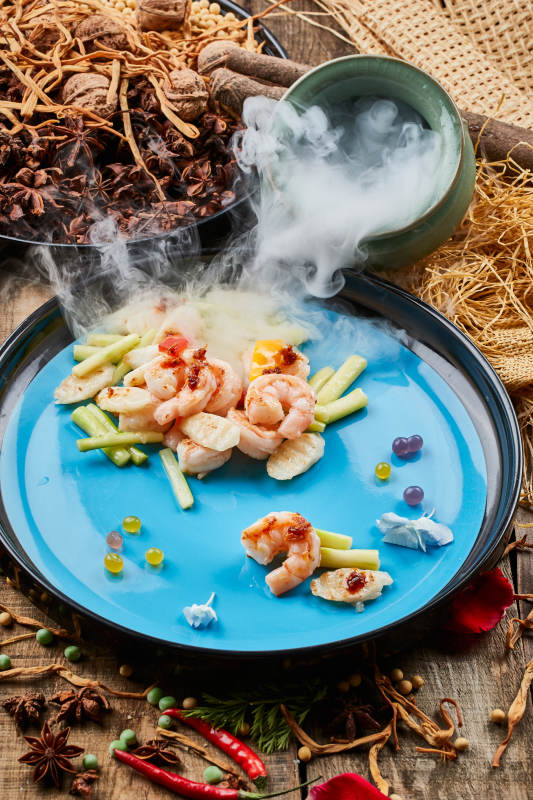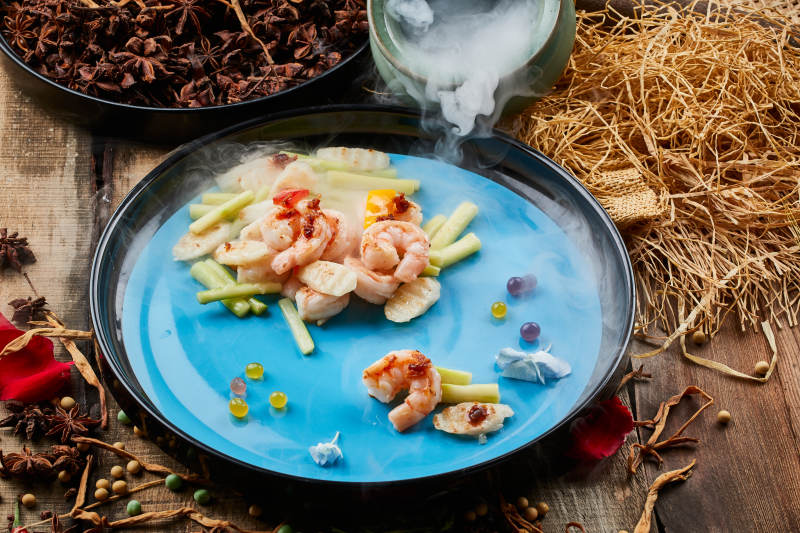 陈旧木板上的双色圆瓷盘装的芦笋山药焗虾仁