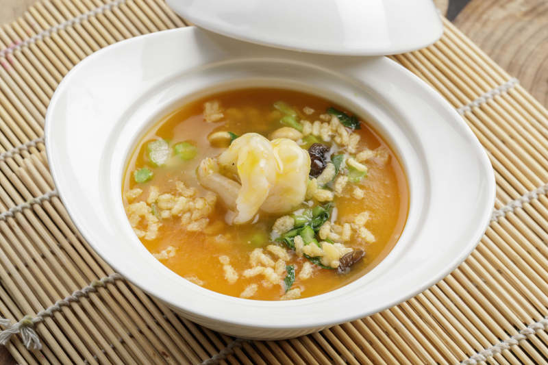 白色瓷餐具装的鱼翅虾仁海鲜浓汤