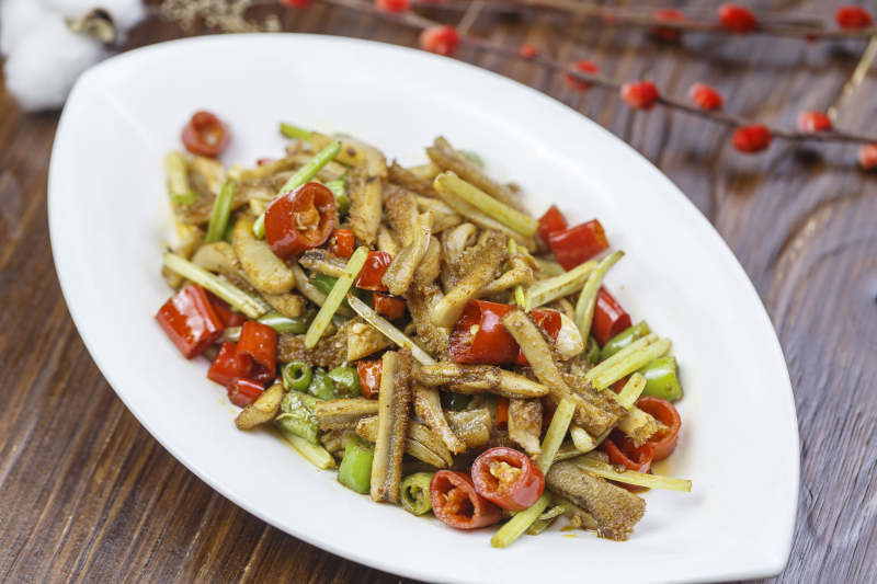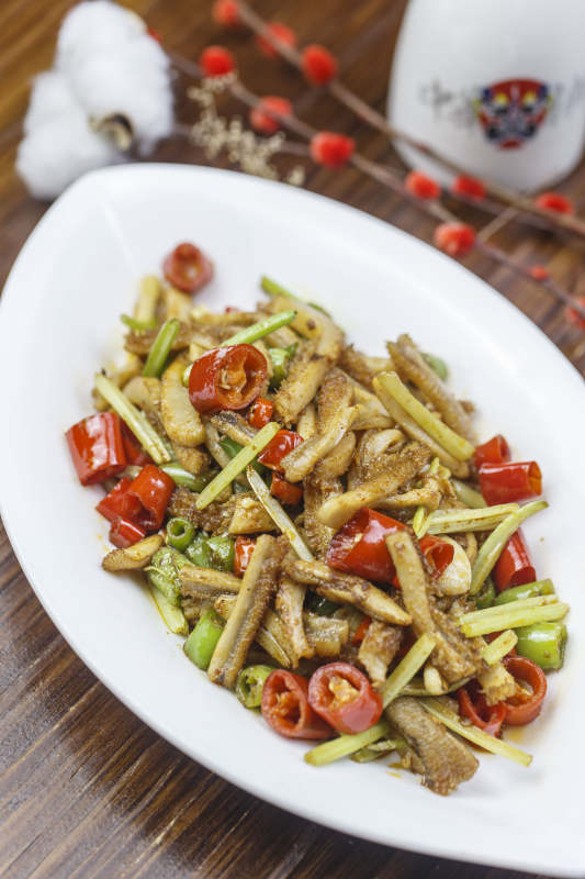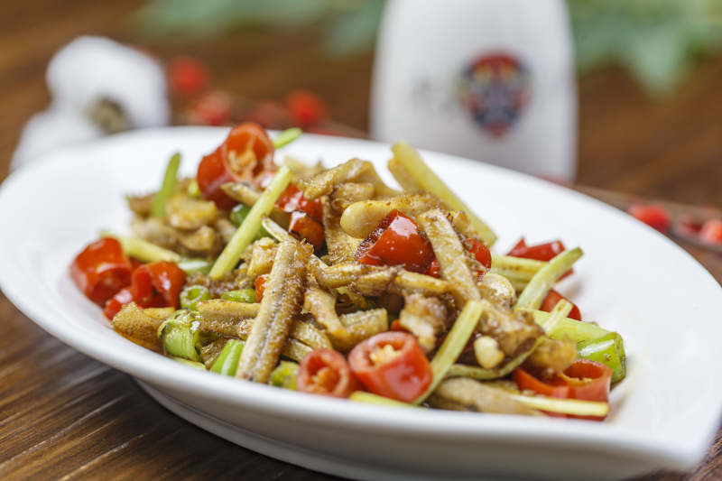 树叶形瓷盘装的湘味小炒猪儿五花肉