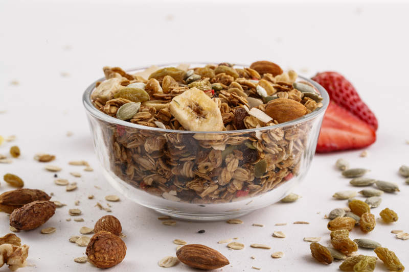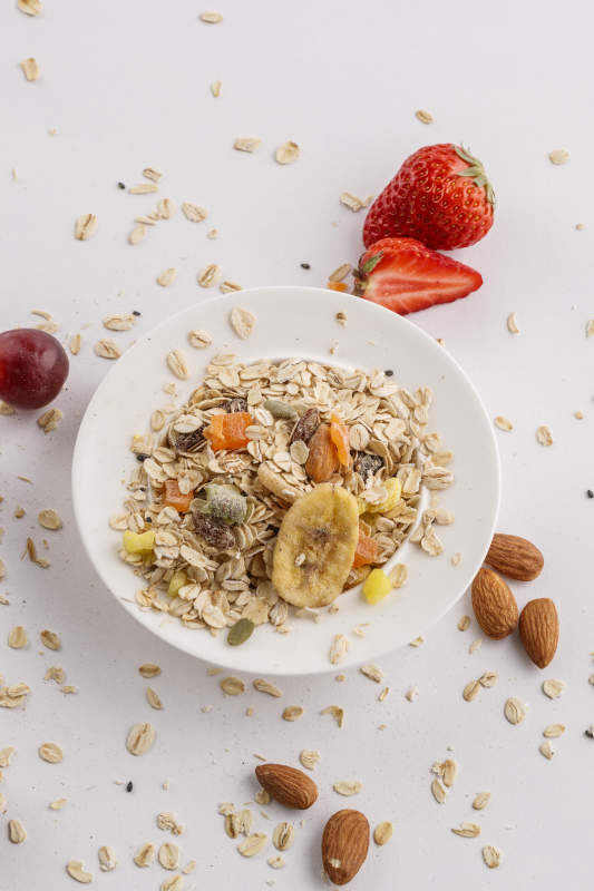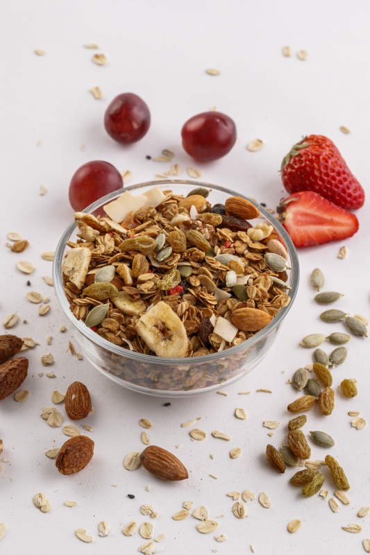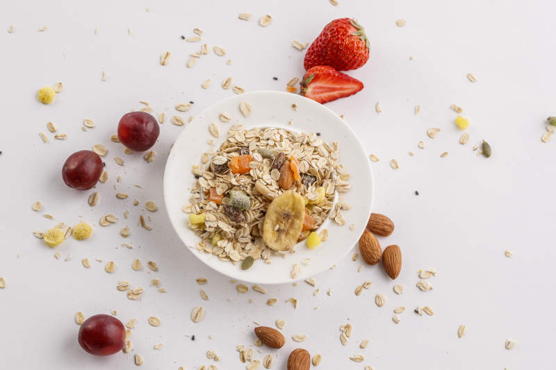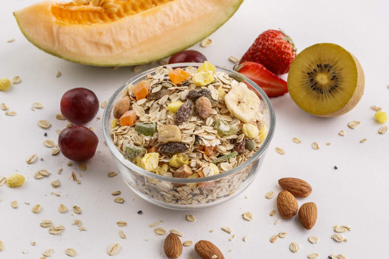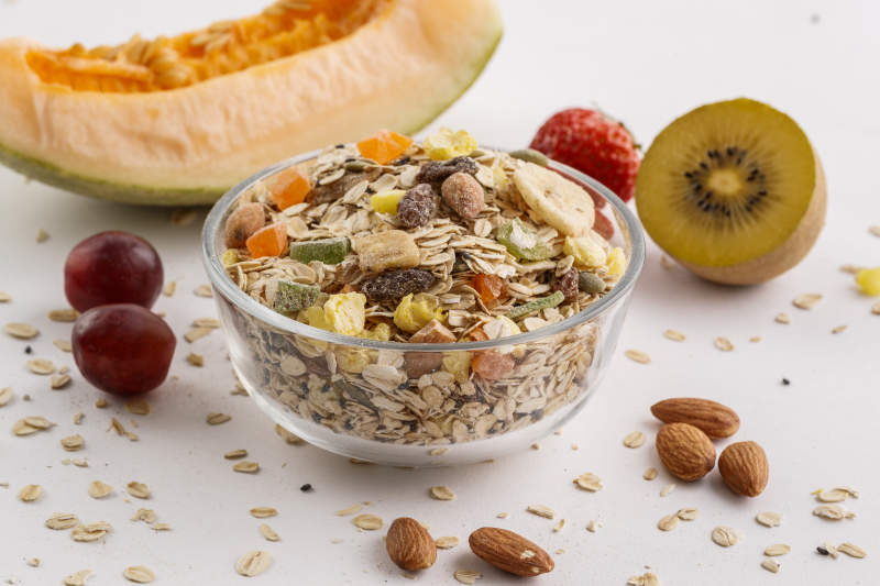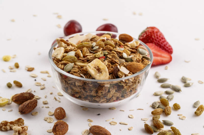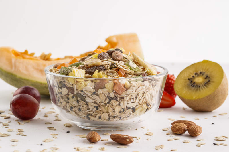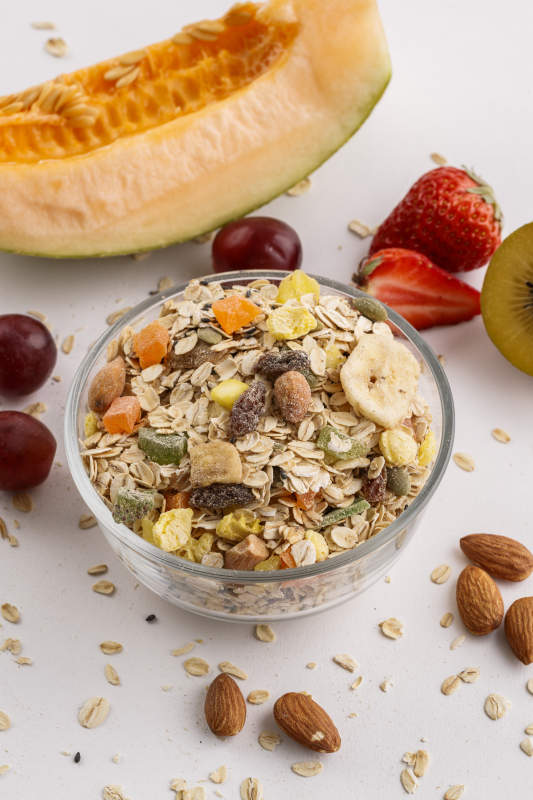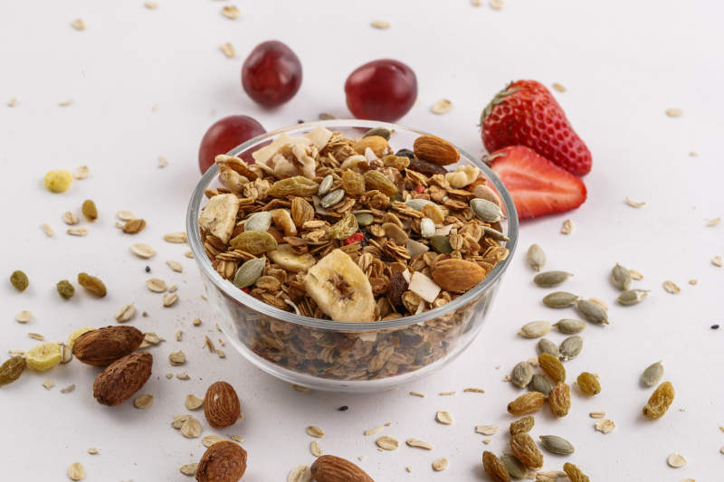 自制的水果坚果混合燕麦铺洒摆放在桌子上