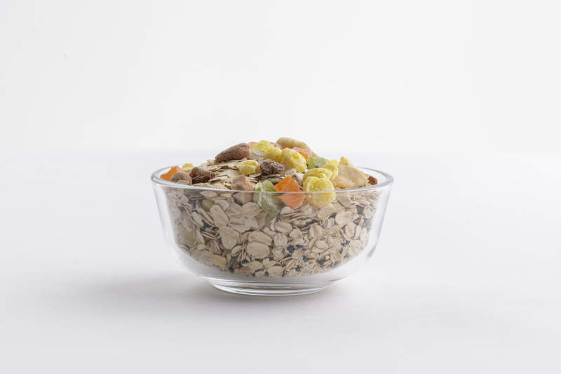自制的水果坚果混合燕麦铺洒摆放在桌子上
