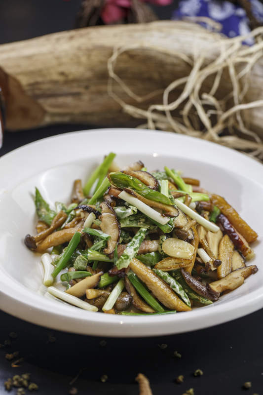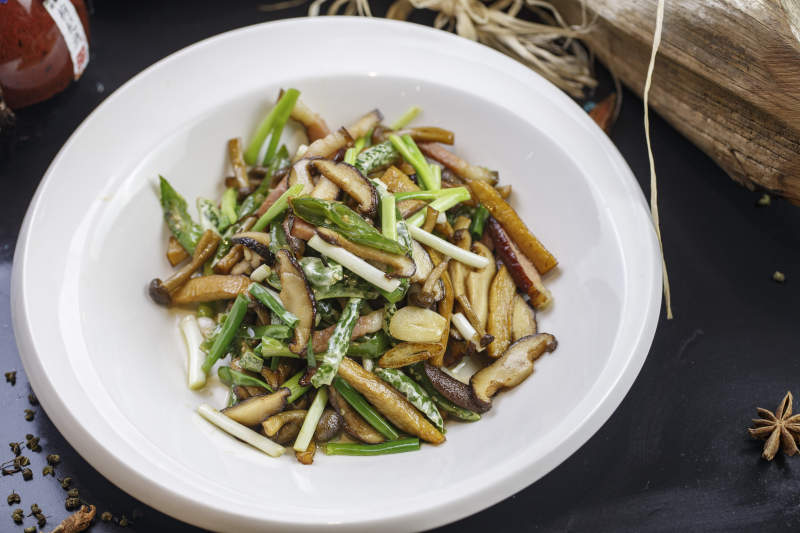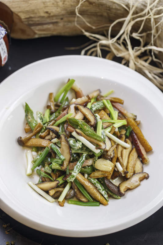 圆形白色瓷盘装的腊肉小炒山珍菌