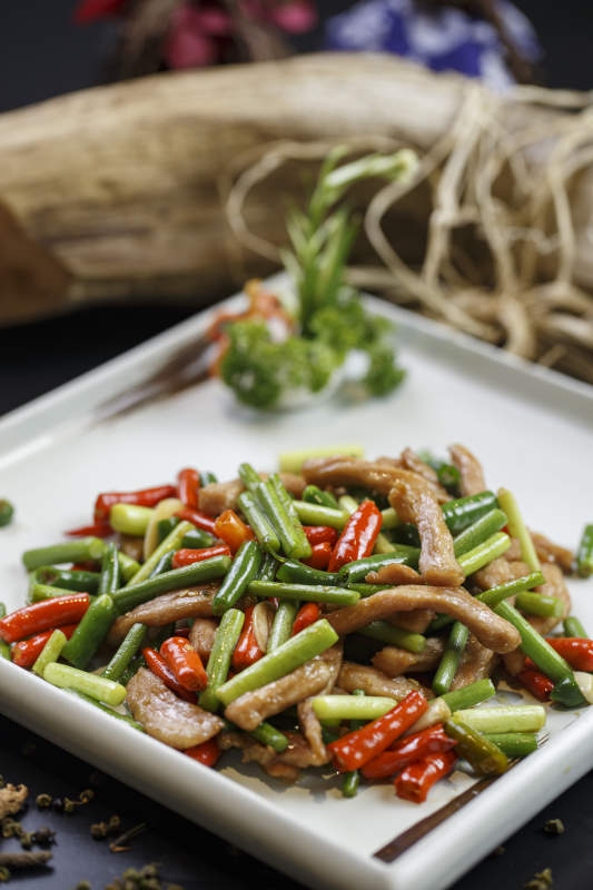 方形白瓷盘装的香辣蒜薹小炒肉