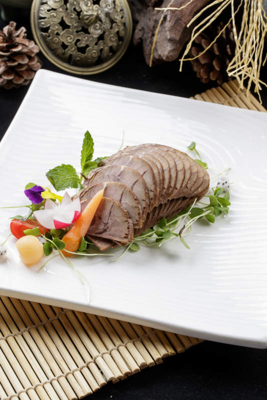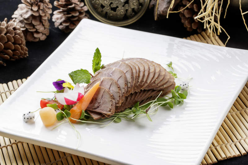寿司帘上的方瓷盘装的五香牛腱