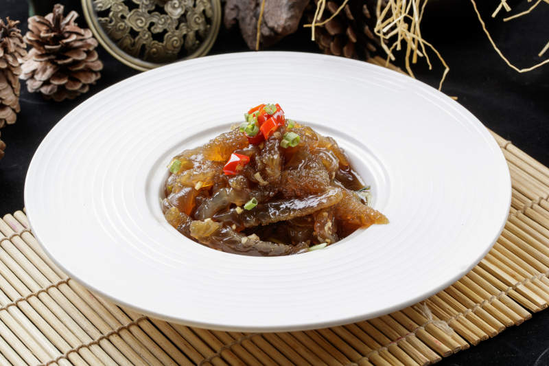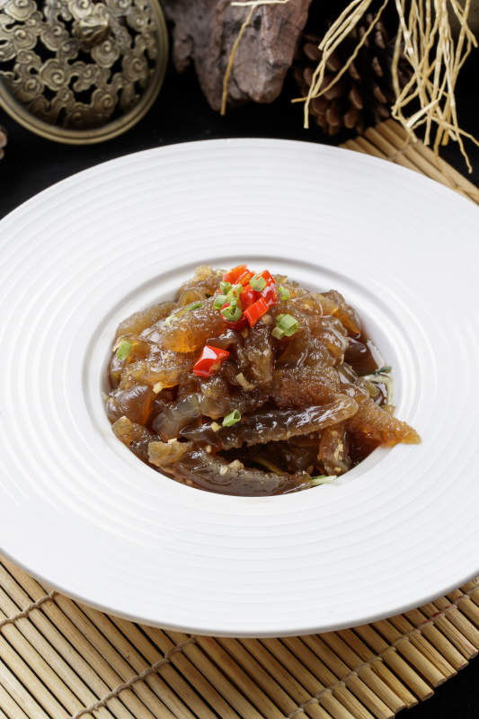 寿司帘上的圆瓷盘装的老醋蛰头