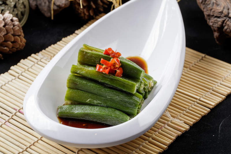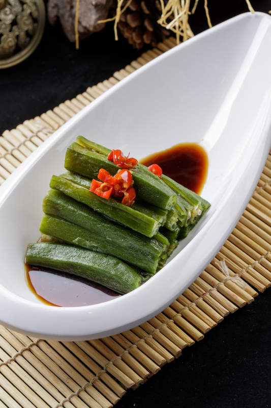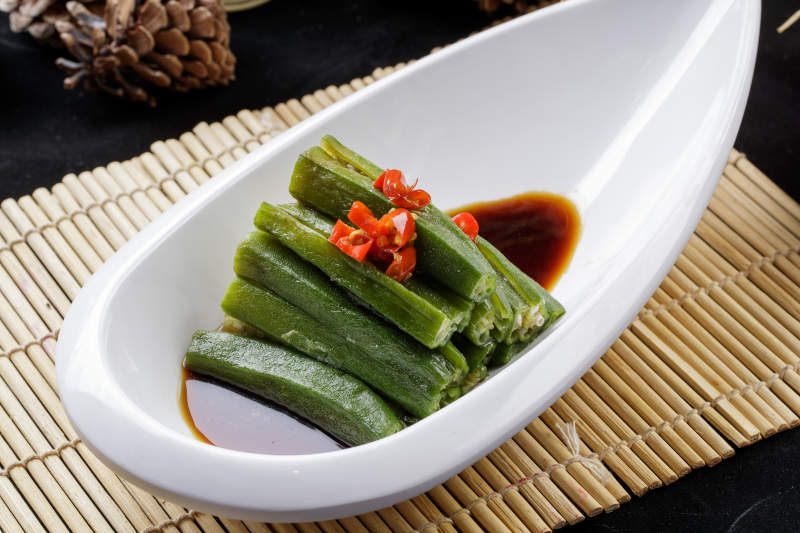 寿司帘上的元宝形瓷盘装的浇汁秋葵