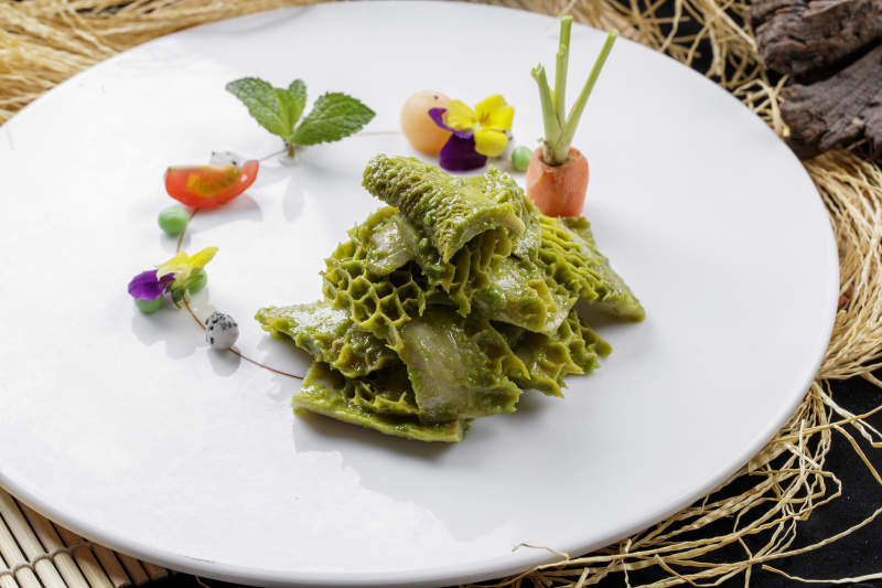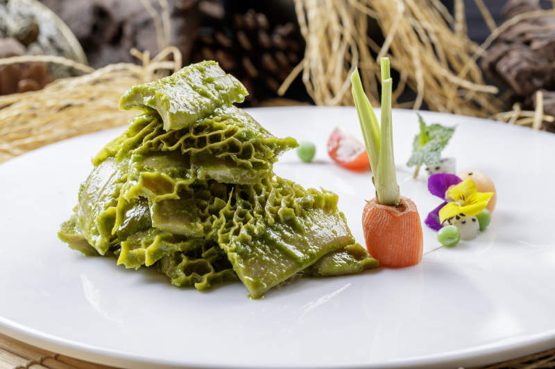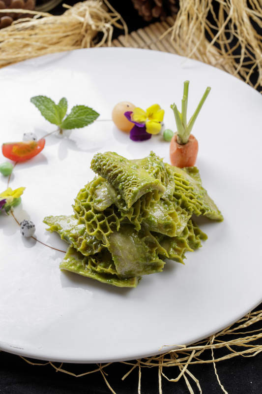 异形瓷盘装的虫草花蕨菜