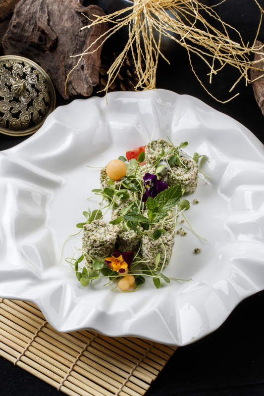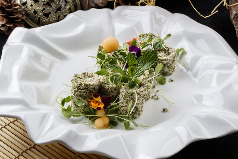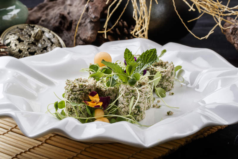 寿司帘上的花边瓷盘装的香椿苗麻豆腐