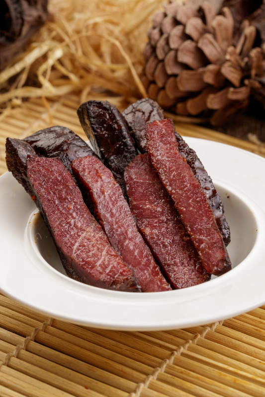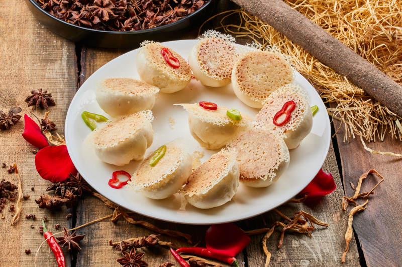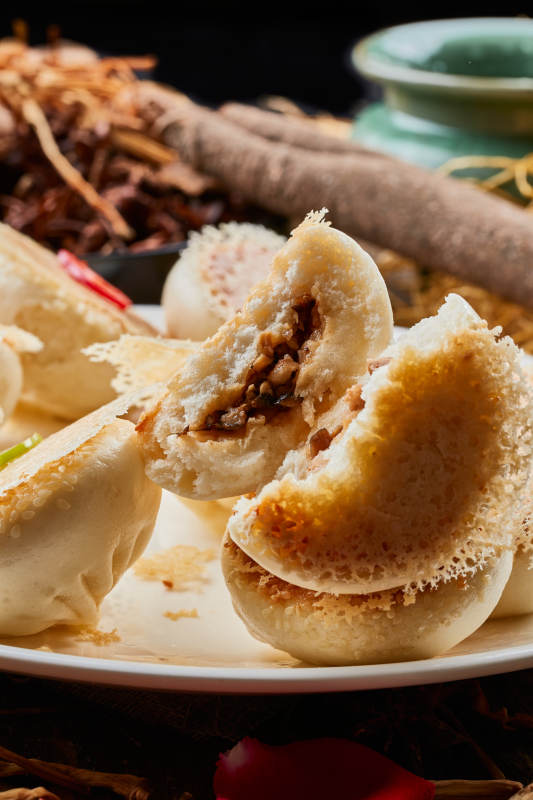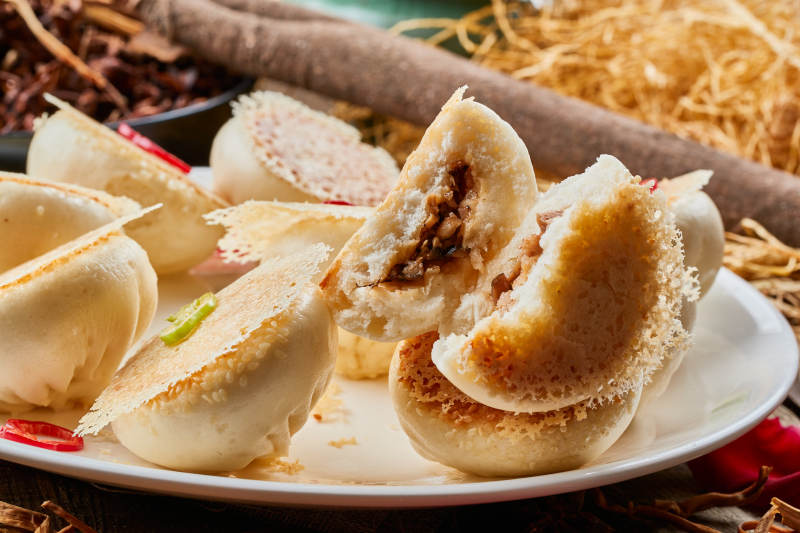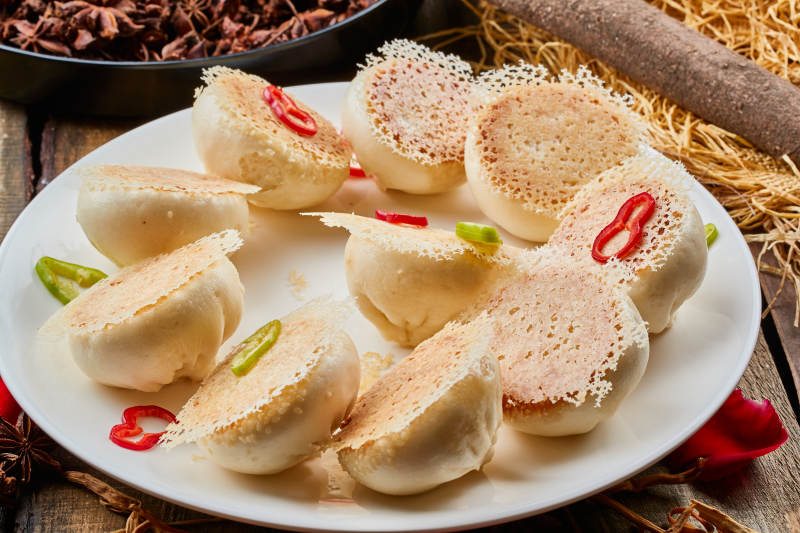 陈旧木板上的圆瓷盘装的水煎渔网酱肉包