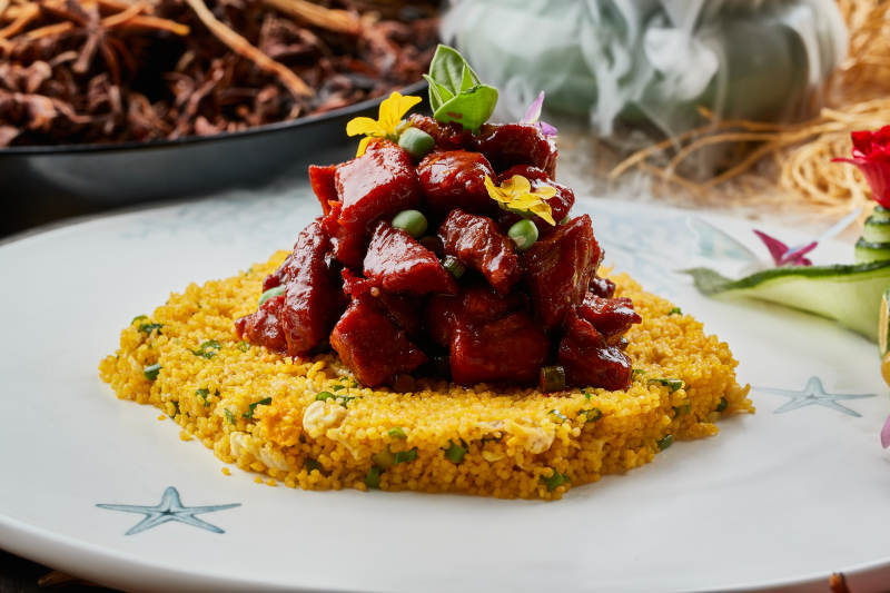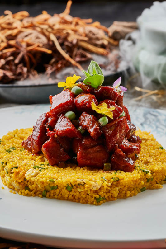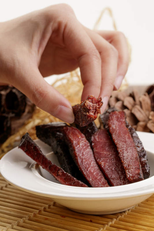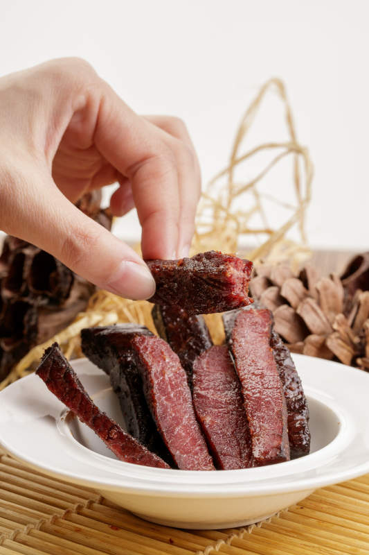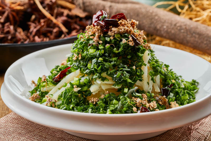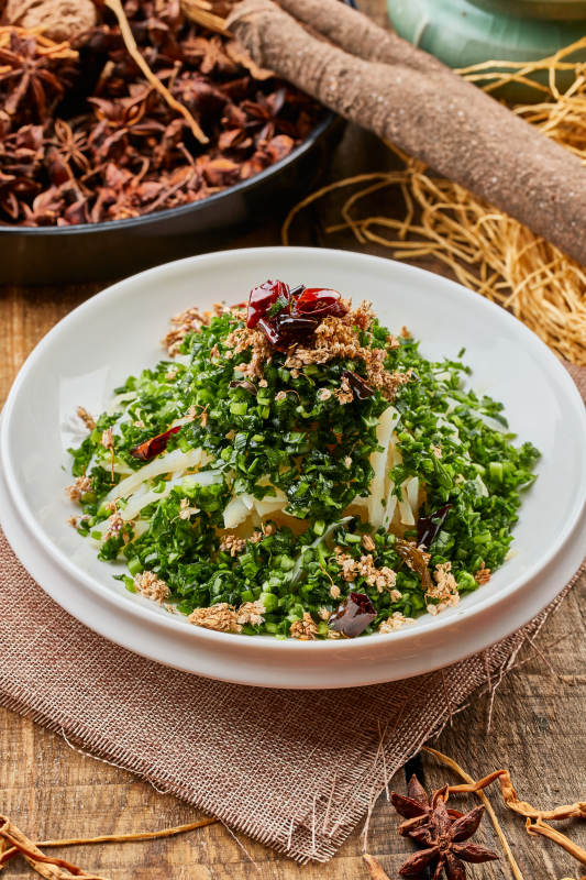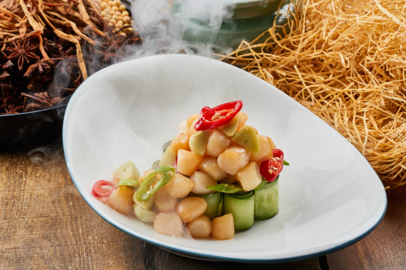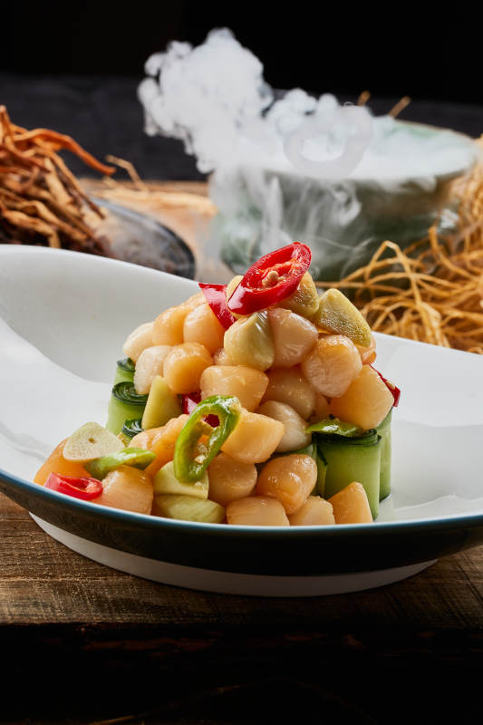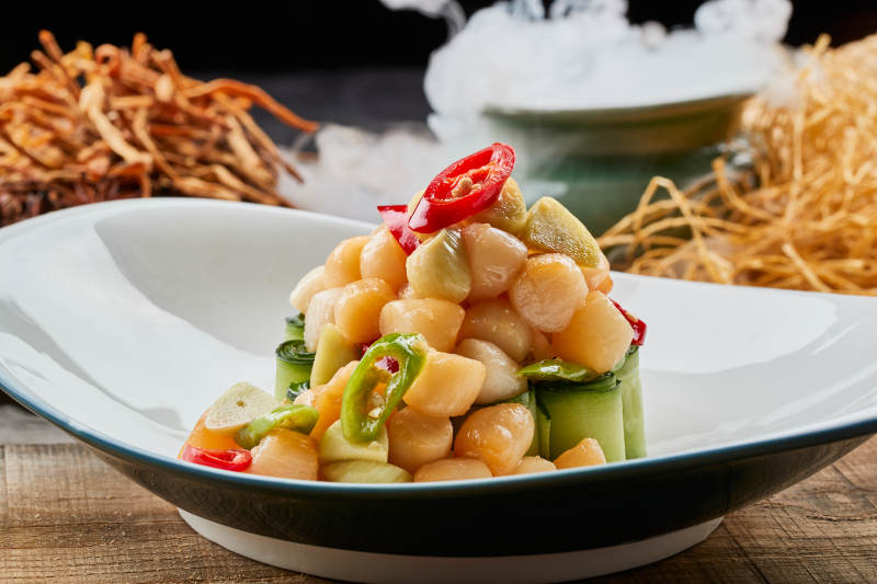 陈旧木板上的月牙瓷盘装的蒜香瑶柱带子