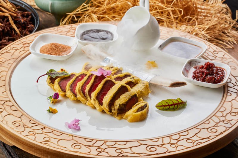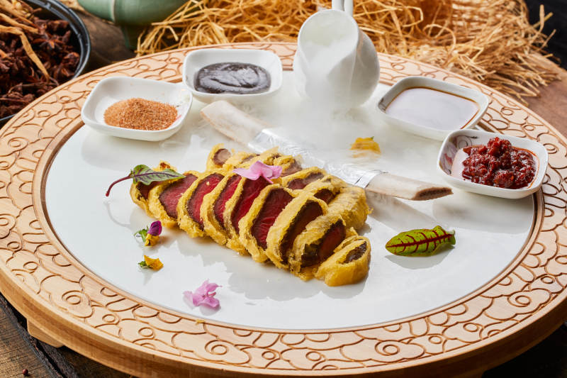 陈旧木板上的奢华餐具装的香炸蘸酱牛里脊