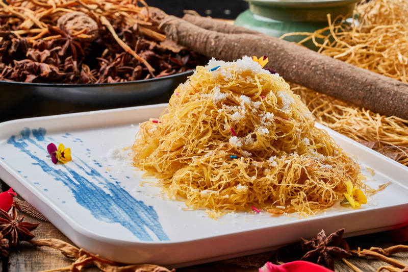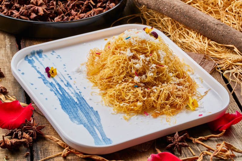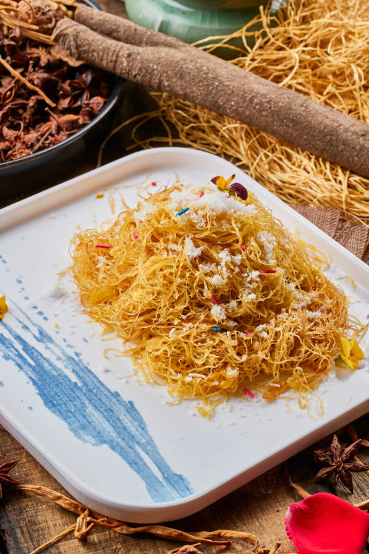 陈旧木板上的方瓷盘装的撒糖一窝丝