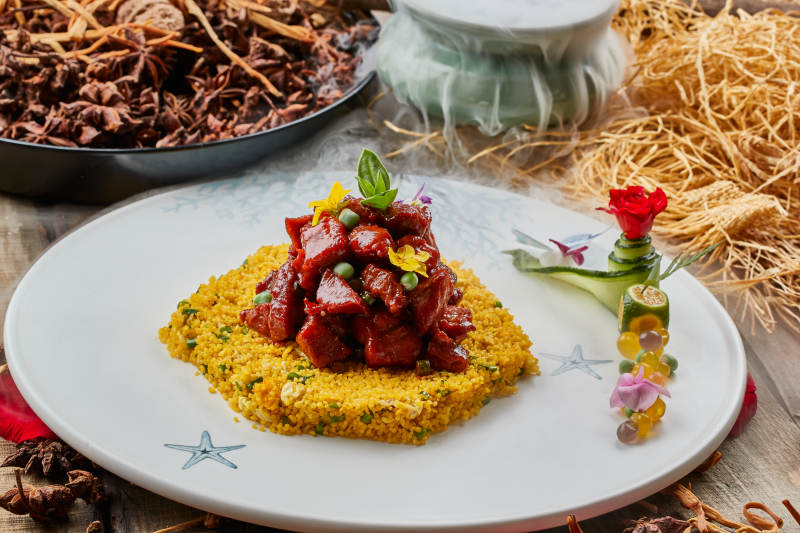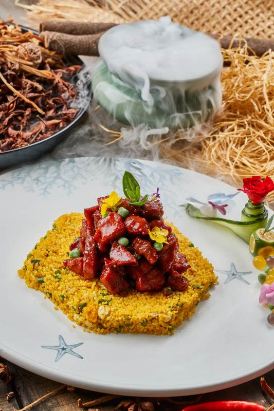 陈旧木板上的双色青釉圆盘装的云南醉鱼