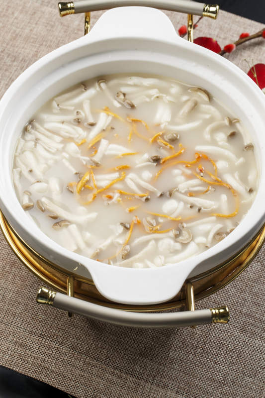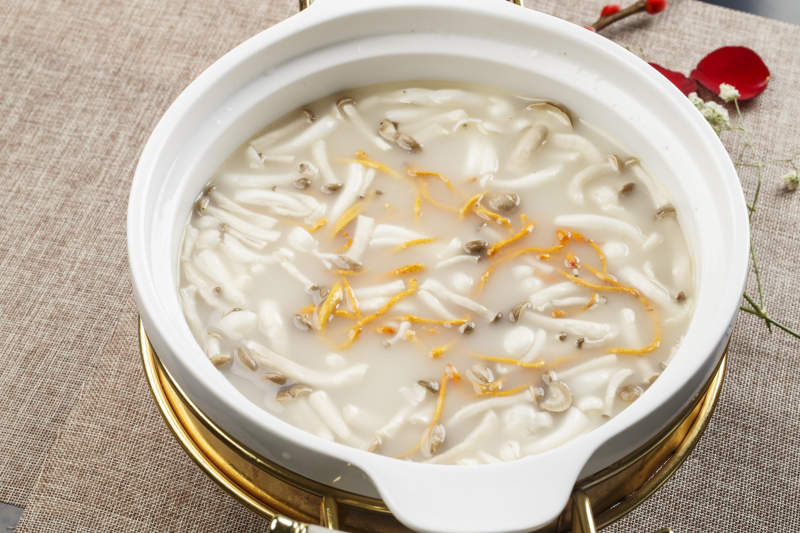 白色瓷盆装的虫草花山珍菌汤羹