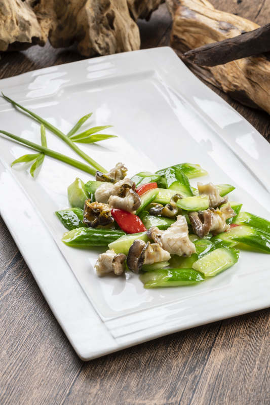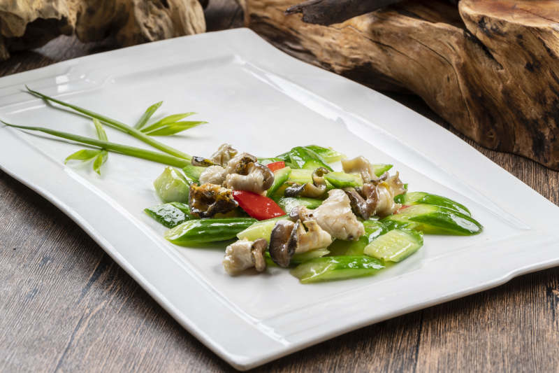 白色瓷盘装的捞汁黄瓜