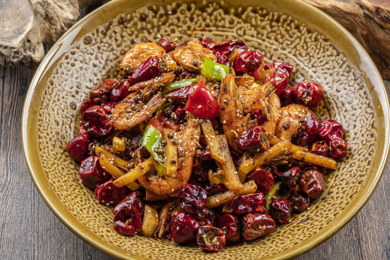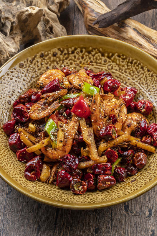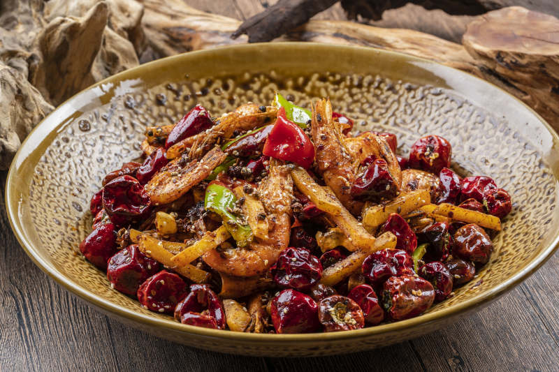 精美餐具装的麻辣香锅虾