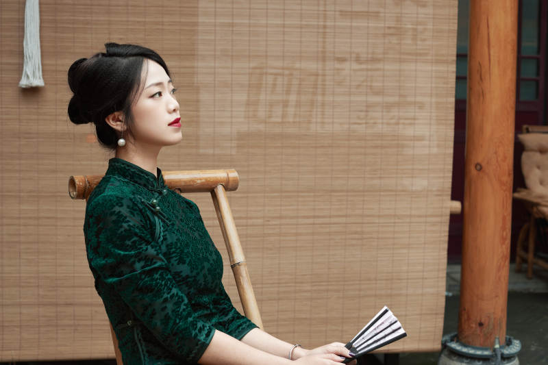 坐在中式庭院里身穿复古旗袍的亚洲女性