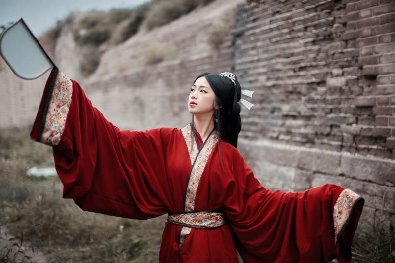 身穿战国袍在古城游玩拍照的东方美女