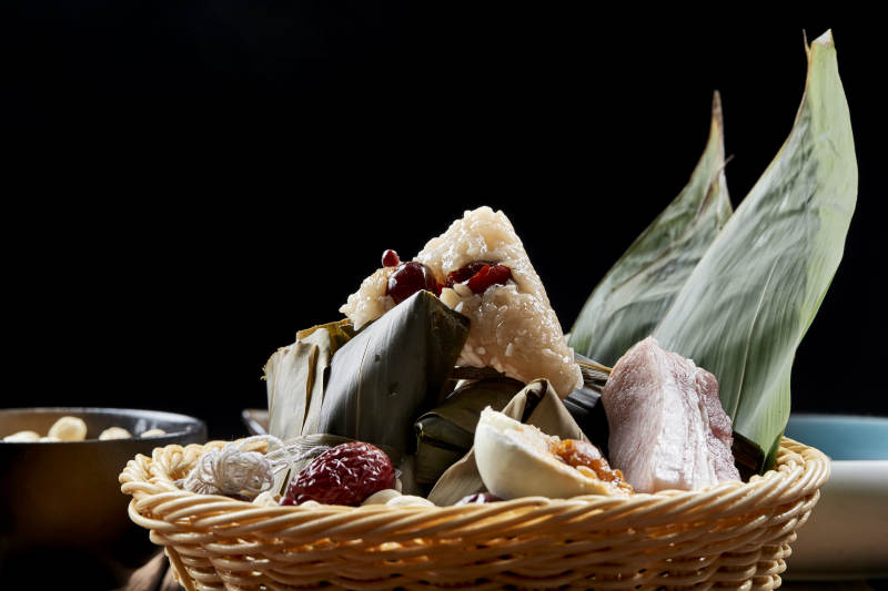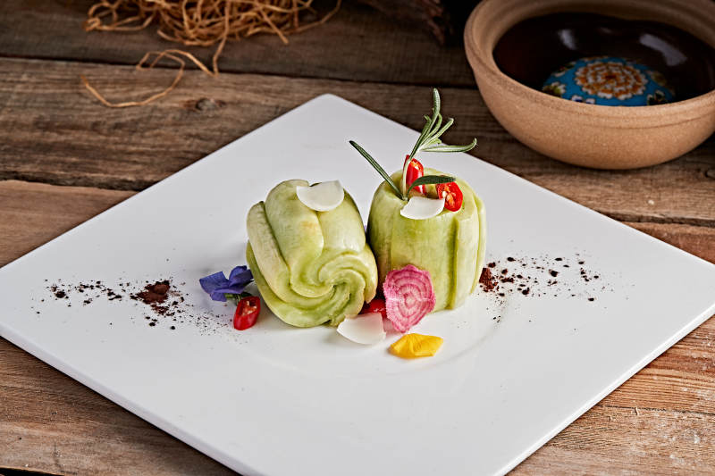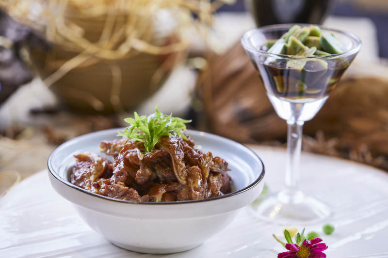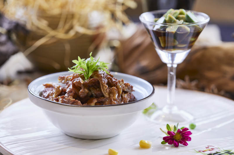 木质餐具装的杂粮饼时蔬配红烧肘子