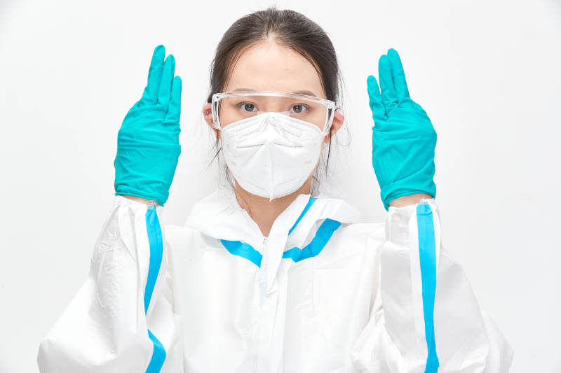 穿白色防护服佩戴护目镜口罩的女性防护人员