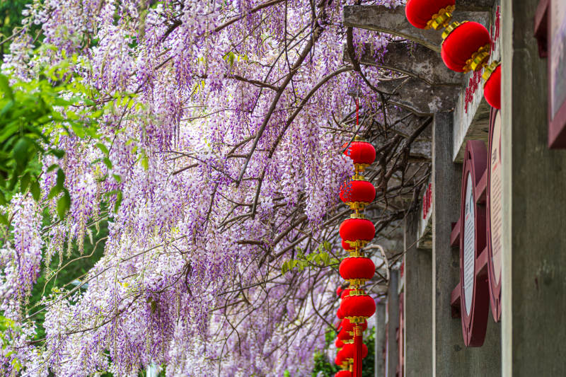 紫藤花下红灯笼