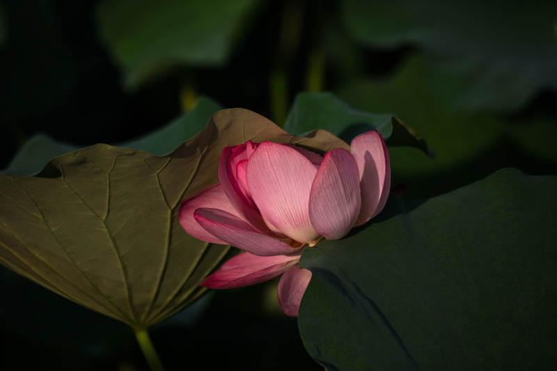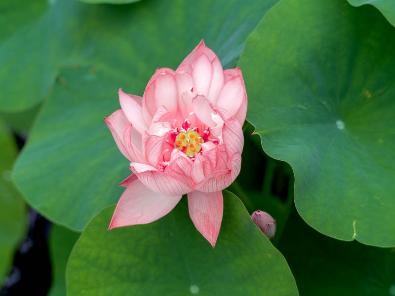 粉莲绽放于绿叶间