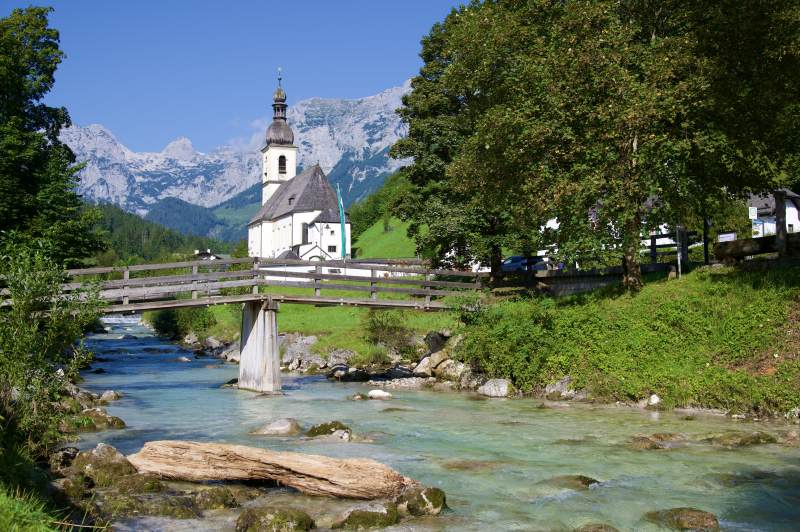 山间溪流蓝天与教堂
