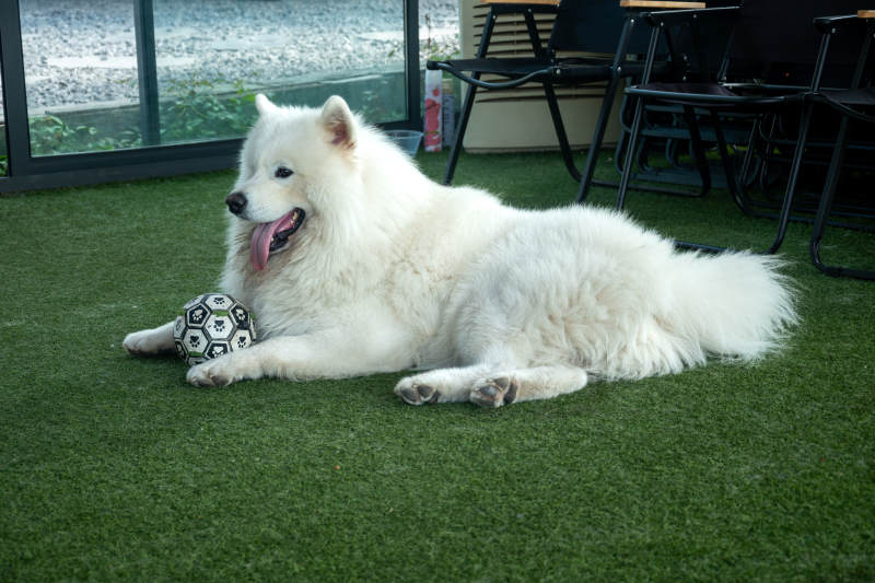 白狗躺草地玩球
