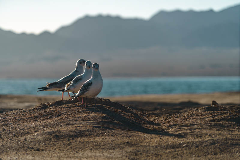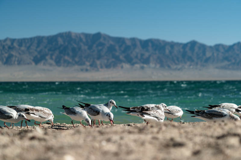 湖畔群鸥伫立金色沙滩与蓝天山脉构成画卷
