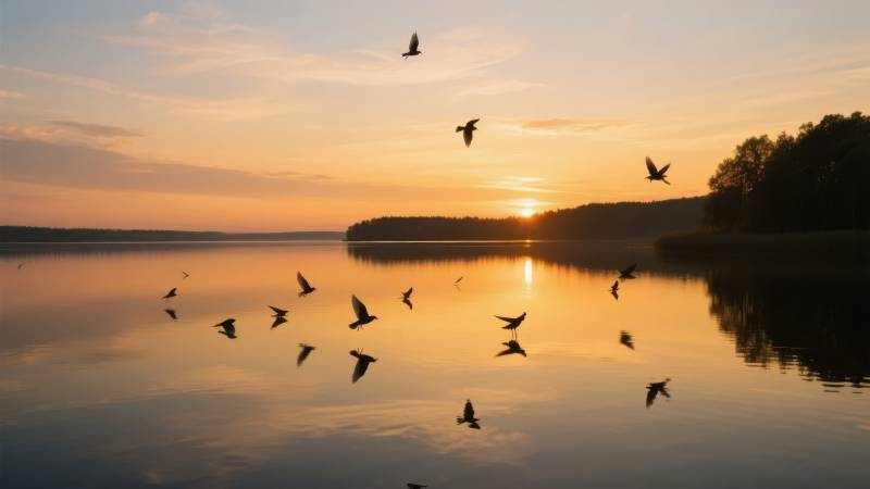 湖上飞鸟夕阳美