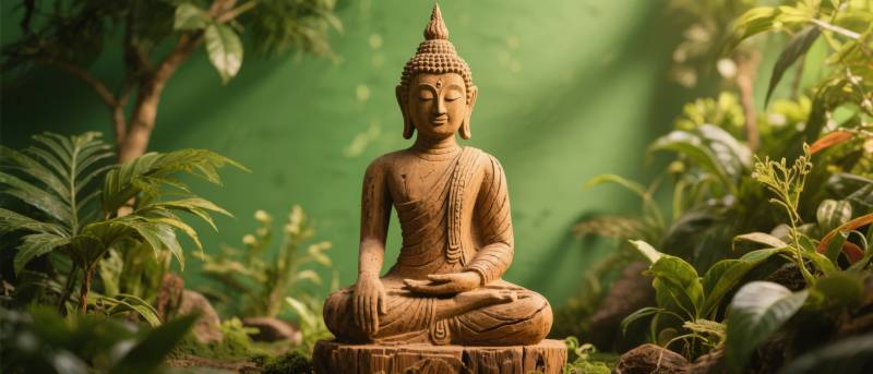禅意佛像静坐绿植中