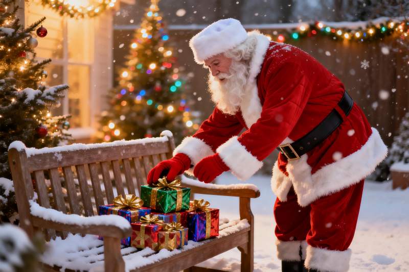 圣诞老人雪夜户外摆放礼物