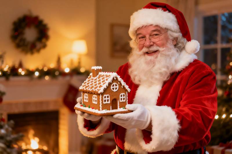 圣诞老人手持姜饼小屋庆祝节日