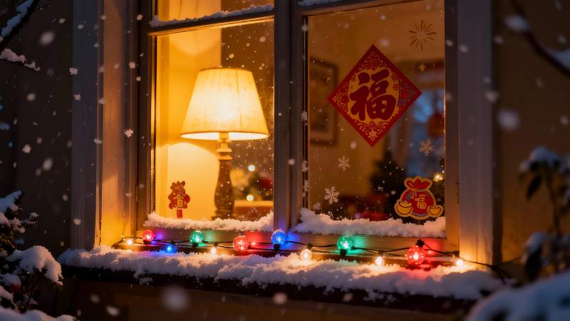 雪夜窗景温馨节日氛围
