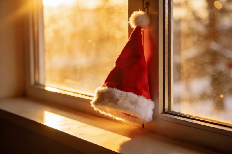圣诞帽置于窗边木质台面