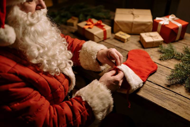 圣诞老人缝制袜子准备礼物