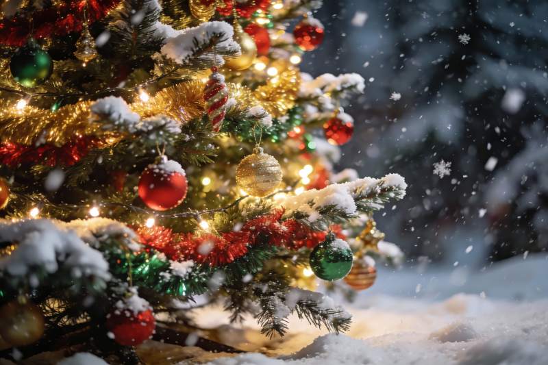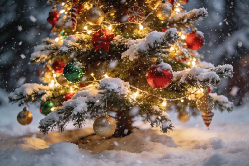 雪中圣诞树挂满彩球